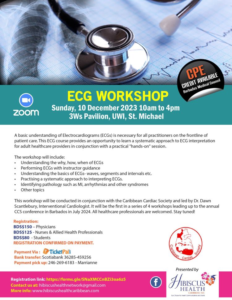 This workshop will be conducted in conjunction with the Caribbean Cardiac Society and led by Dr. Dawn Scantlebury, Interventional Cardiologist. It will be the first in a series of 4 workshops leading up to the annual CCS conference in Barbados in July 2024. All healthcare professionals are welcomed. Stay tuned!