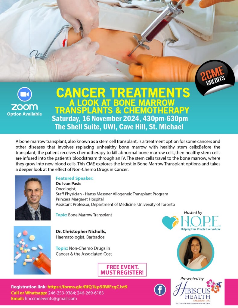 Every year, Hibiscus Health Caribbean in association with H.O.P.E hosts a cancer-focused event. This year we are exploring Bone Marrow Transplants and Non-Chemo Drugs on Saturday, 16 November 2024, 4.30pm-6.30pm at the Shell Suite, UWI, St. Michael or via Zoom. Presenters will be Dr. Ivan Pasic, an Ontario, Canada based Oncologist and Dr Christopher Nicholls, Hematologist from Barbados.