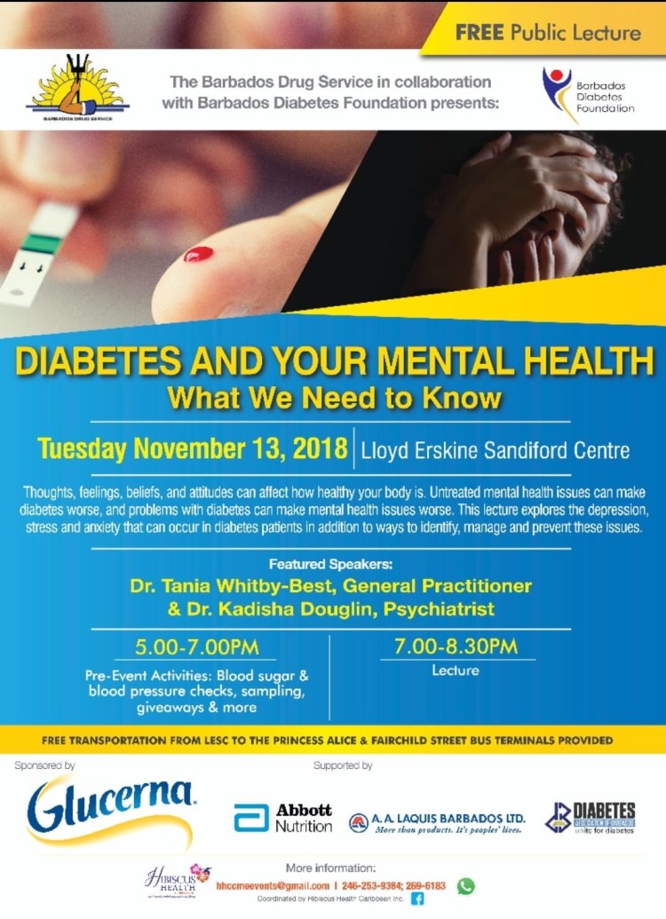 Individuals living with type 1 or type 2 diabetes are at increased risk for depression, anxiety, and eating disorder diagnoses. Among the wide-ranging conditions associated with diabetes, mental health issues are probably among the most overlooked, despite their potential to compromise self-management and increase risk for serious short- and long-term complications, which can result in blindness, amputations, stroke, cognitive decline, decreased quality of life, and premature death. This public lecture explores the intricacies of diabetes and mental health, prevention and management strategies and the resources available in Barbados to assist in the mitigation of this condition.