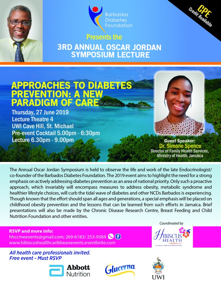 The Annual Oscar Jordan Medical Symposium is held to observe the life and work of the late Oscar Jordan, Endocrinologist and co-founder of the Barbados Diabetes Foundation. Dr. Jordan worked tirelessly to promote the highest quality of health care in diabetes, a major problem in Barbados and throughout the West Indies.
