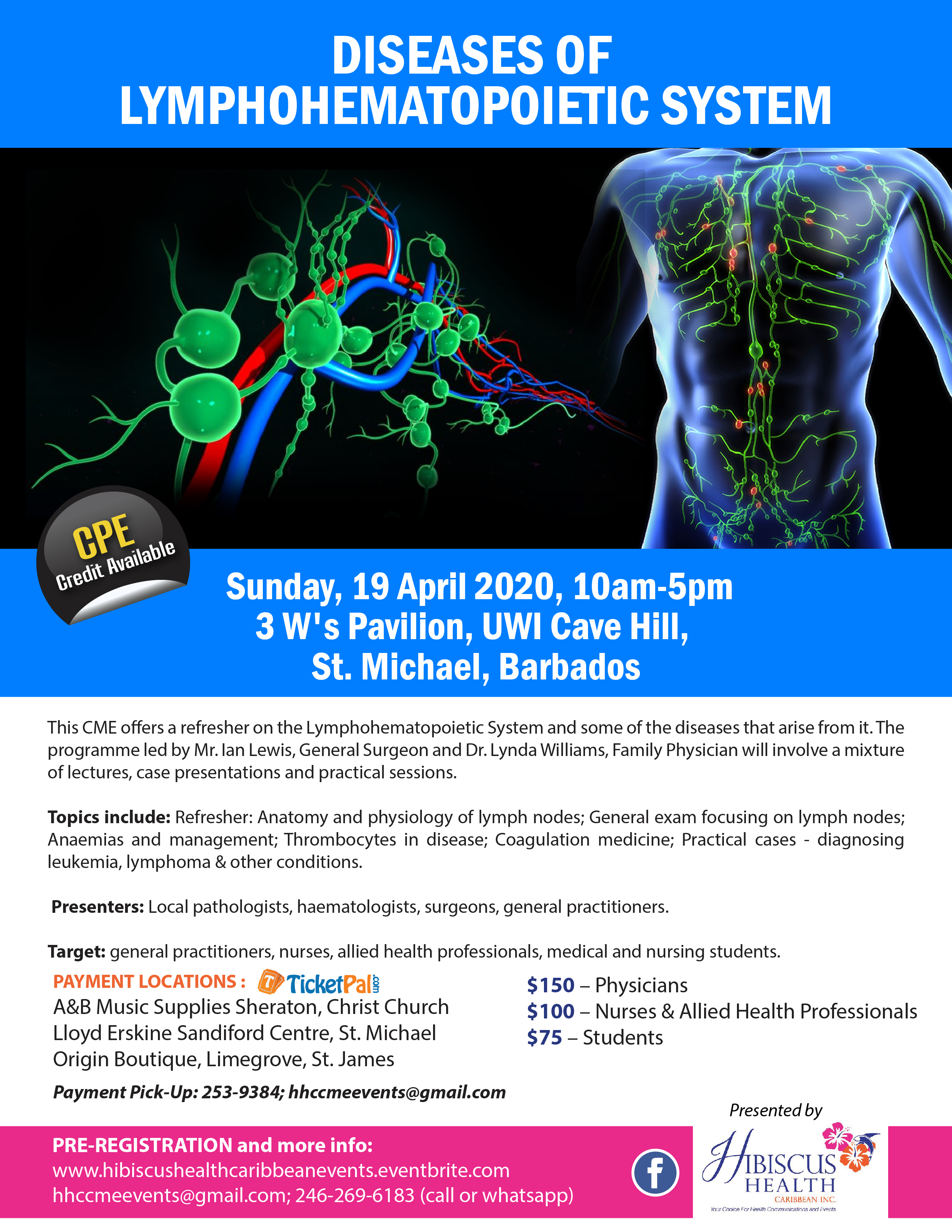 This CME offers a refresher on the Lymphohematopoietic System and some of the diseases that arise from it. The programme led by Mr. Ian Lewis, General Surgeon and Dr. Lynda Williams, Family Physician will involve a mixture of lectures, case presentations and practical sessions.