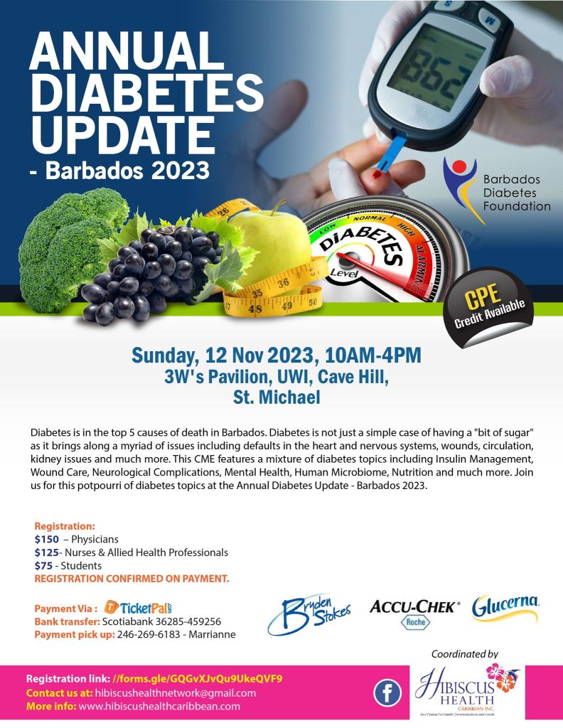 Diabetes is in the top 5 causes of death in Barbados. Diabetes is not just a simple case of having a “bit of sugar” as it brings along a myriad of issues including defaults in the heart and nervous systems, wounds, circulation, kidney issues and much more. This CME presents a mixture of topics that will explore the gut microbiome, obesity, trace elements and insulin resistance, the nervous system, behaviour and cognitive therapy and more. A workshop on insulin initiation and adjustment will be included. Join us for this potpourri of diabetes topics at the Annual Diabetes Update – Barbados 2023..