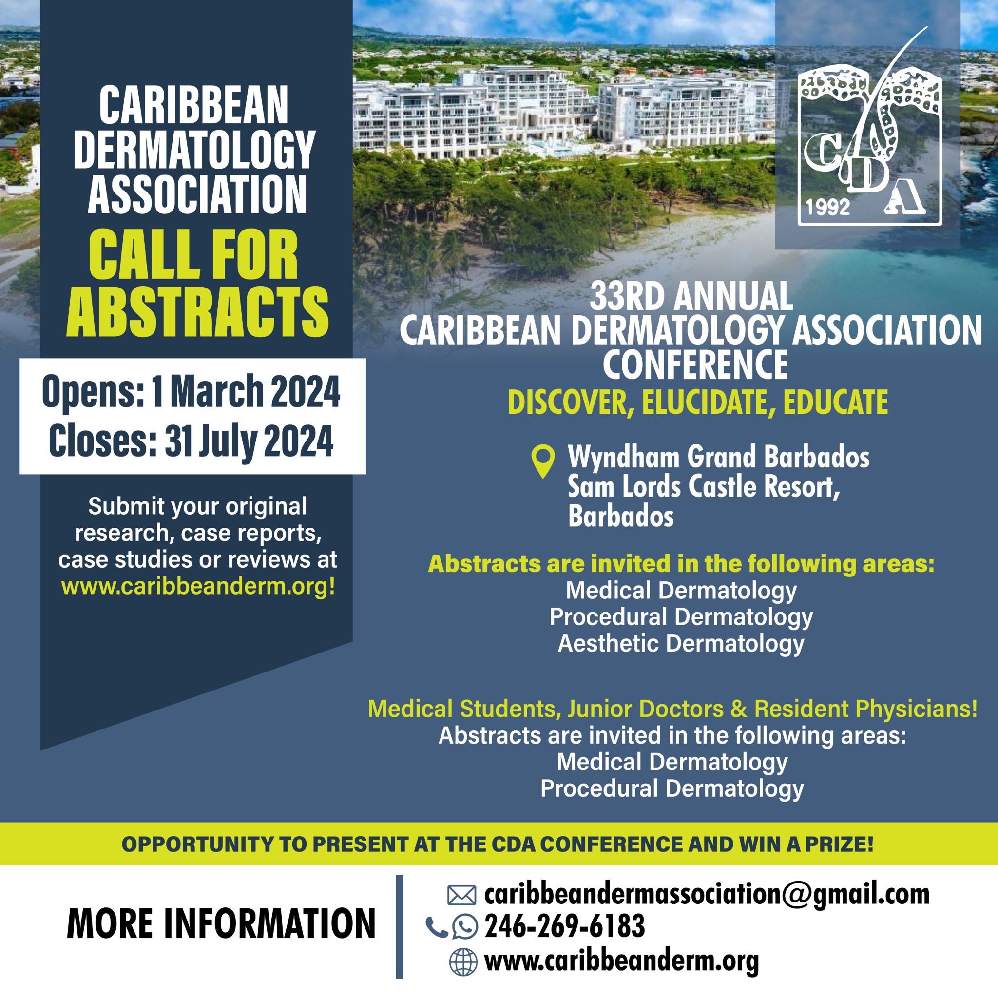 The Caribbean Dermatology Association is pleased to announce their annual conference at the Wyndham Grand Barbados Resort in Barbados, 6-9 November 2024. This conferene will feature dermatologists from all over the Caribbean with guest speakees from Canada and the UK. Topics will cover areas of medical, procedural and aesthetic dermatology with a brand new module in aesthetic dermatology being featured.