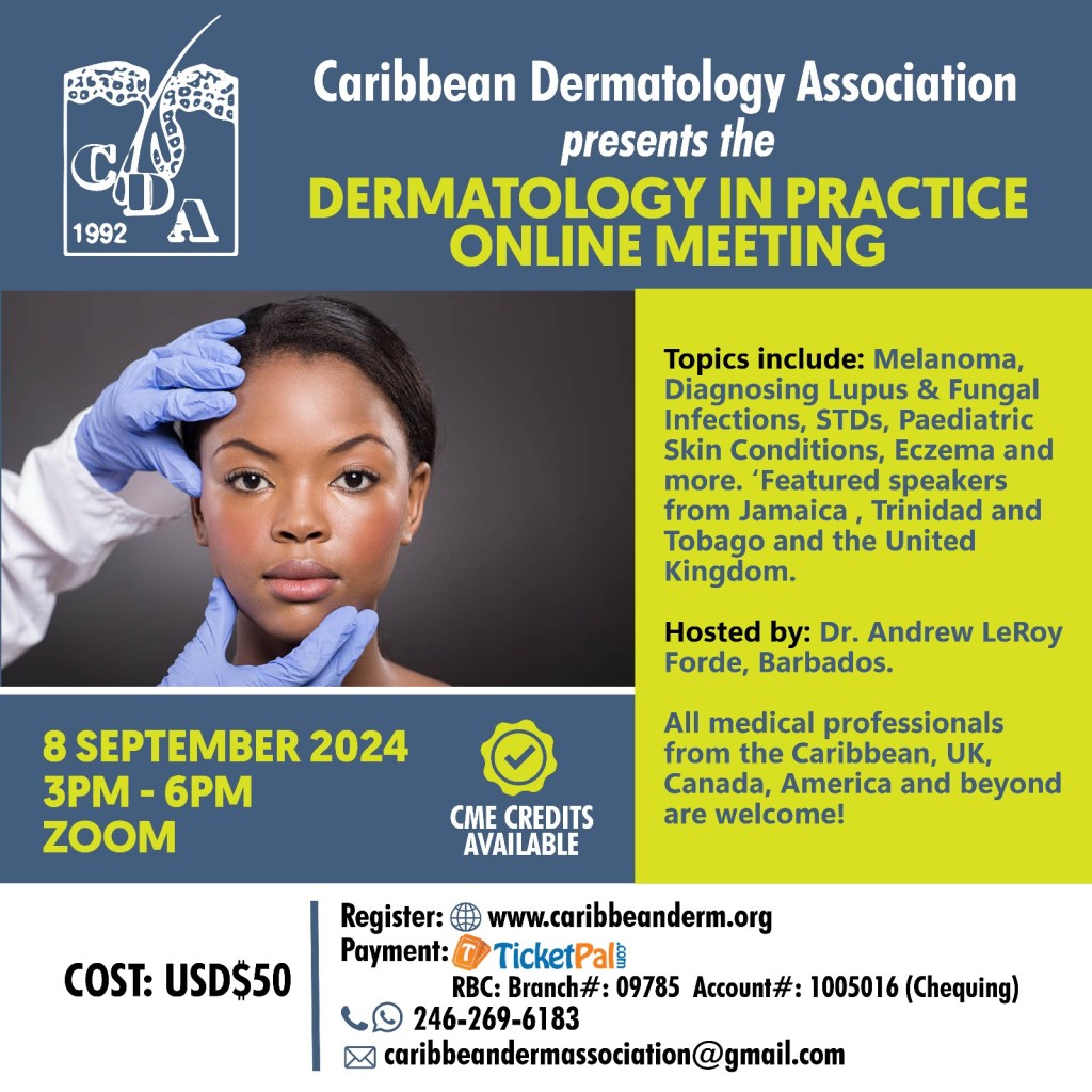 Hibiscus Health Caribbean Inc. is pleased to be working with the Caribbean Dermatology Association this year and we are producing two events: The Dermatology in Practice Online Meeting, 8 September 2024, 3pm-6pm via Zoom and the Annual Caribbean Dermatology Association Conference, 6-9 November 2024 at the All Inclusive Wyndham Grand Barbados Resort, St. Philip.