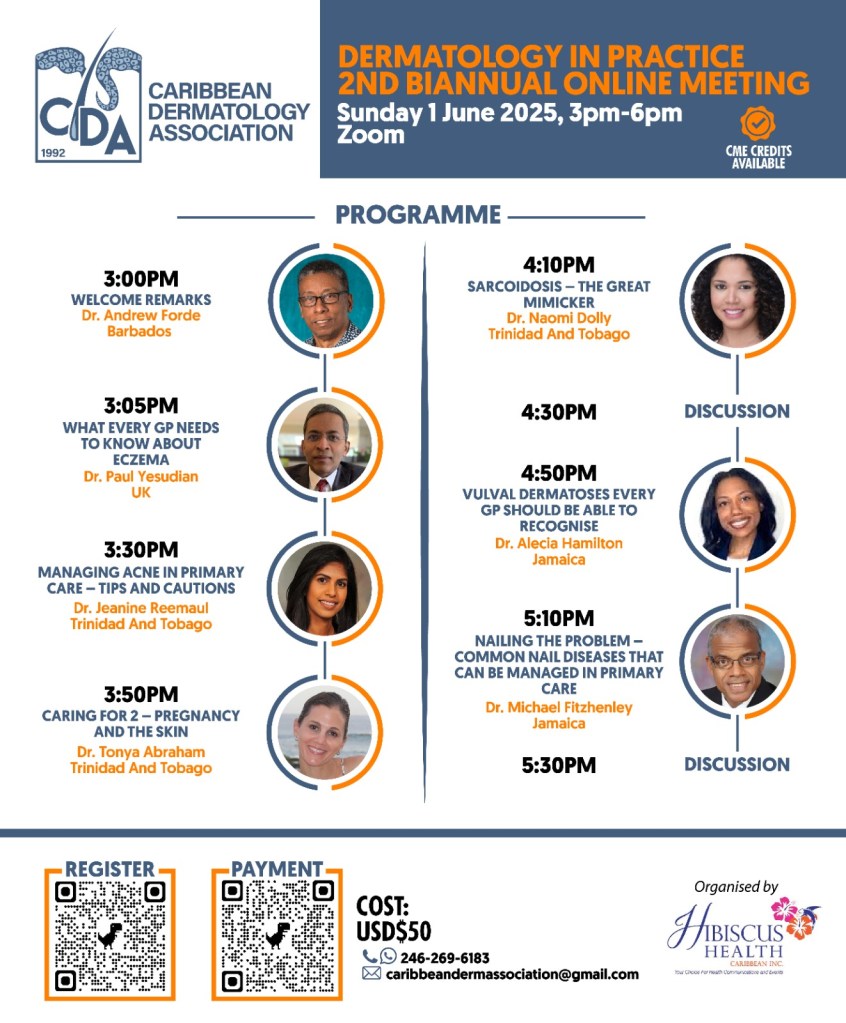 The Dermatology in Practice Online CME event will cover a host of dermatological topics including Eczema, Managing Acne, Pregnancy & the Skin, Sarcoidosis, Vulval Dermatoses & Common Nail Diseases. The goal is to educate on common dermatological issues that pop-up in practice. The faculty includes a host of dermatologists from the UK, Trinidad and Tobago and Jamaica and the CDA invites general practitioners, nurses and other health care professionals to attend the event. The host will be Dr. Andrew LeRoy Forde of Barbados.