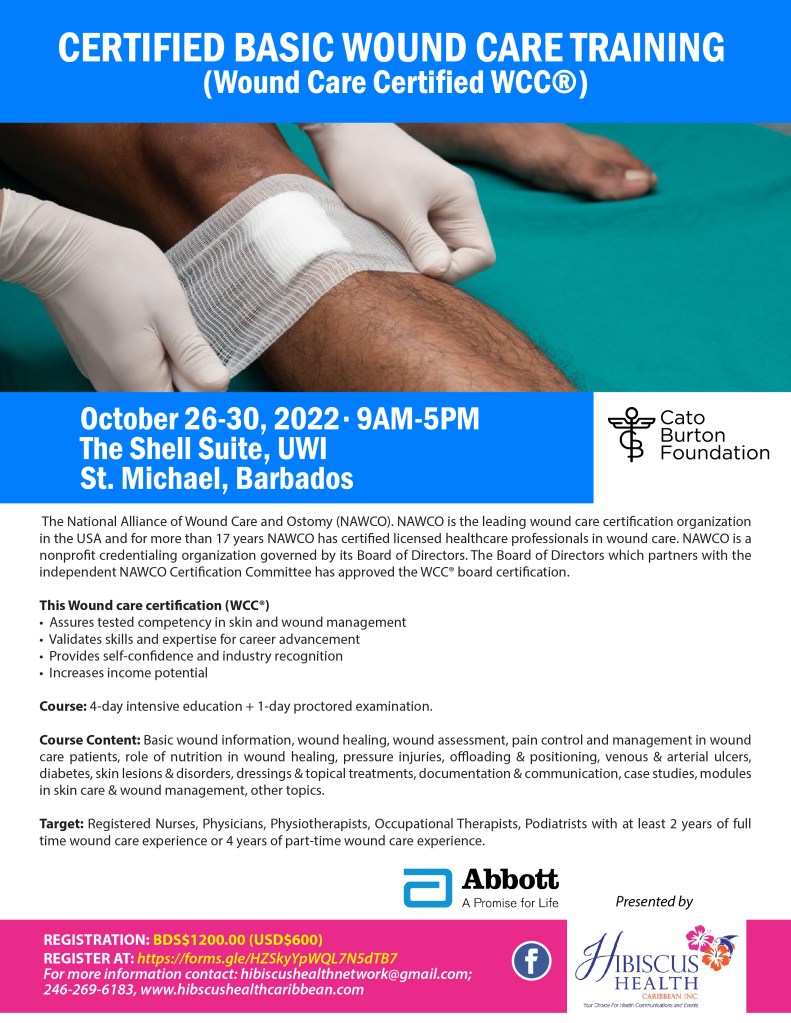 NAWCO trainers will be travelling to Barbados for the first time to certify at least 20 health care professionals in Basic Wound Care Certification. If you are a licensed health professional with an interest in gaining certification and advancing your knowledge in wound care, join us Oct 26-30, 2022 for a 4 day intensive wound care training in additional to a final proctored examination.