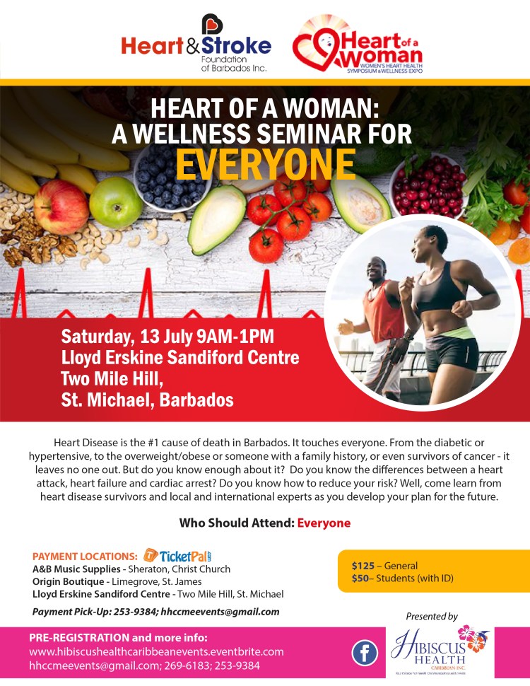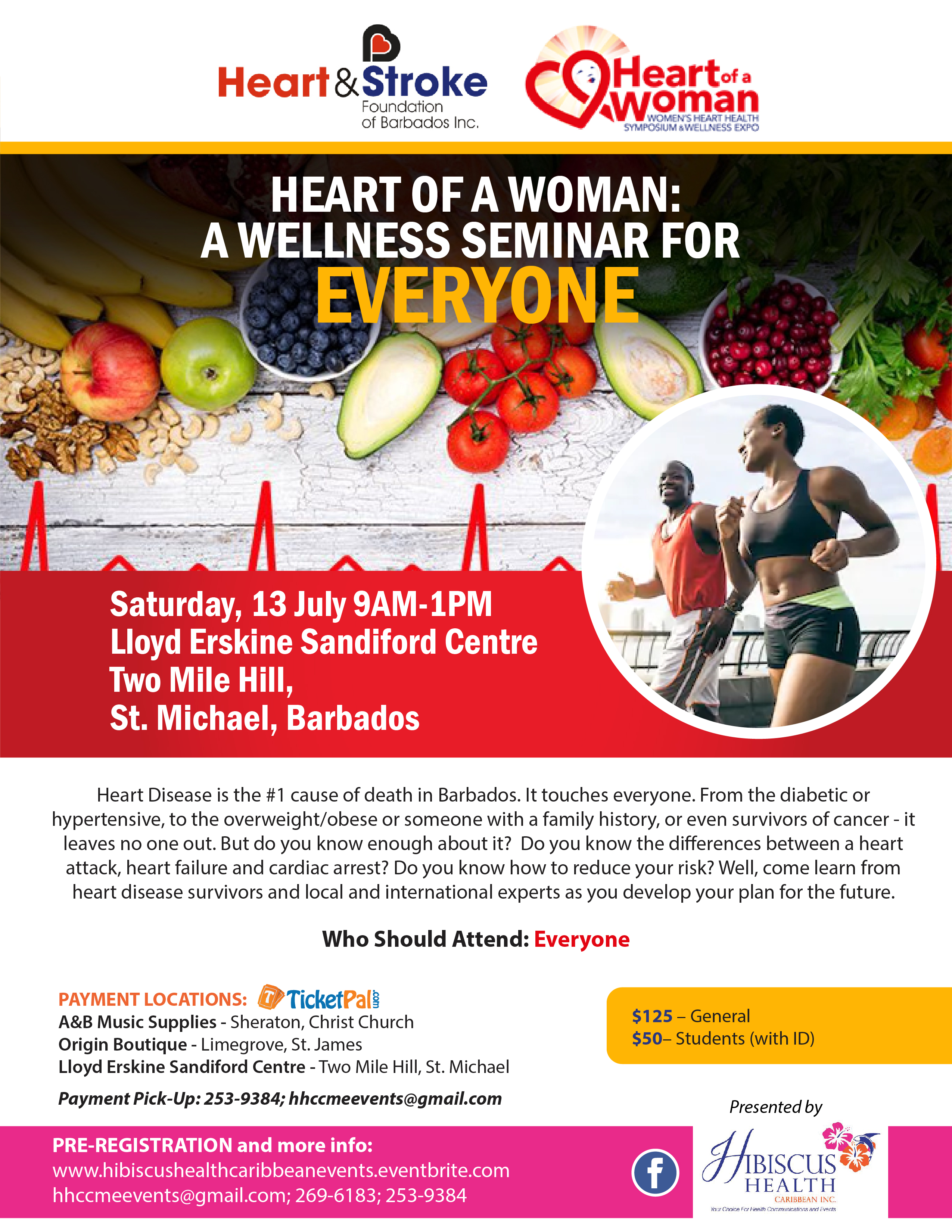 Heart Disease is the #1 cause of death in Barbados. It touches everyone. From the diabetic or hypertensive, to the overweight/obese or someone with a family history, or even survivors of cancer – it leaves no one out. But do you know enough about it? Do you know the differences between a heart attack, heart failure and cardiac arrest? Do you know how to reduce your risk? Well, the Heart and Stroke Foundation of Barbados invites you to attend an exciting Wellness Seminar set to take place on the morning of Saturday July 13th at LESC.