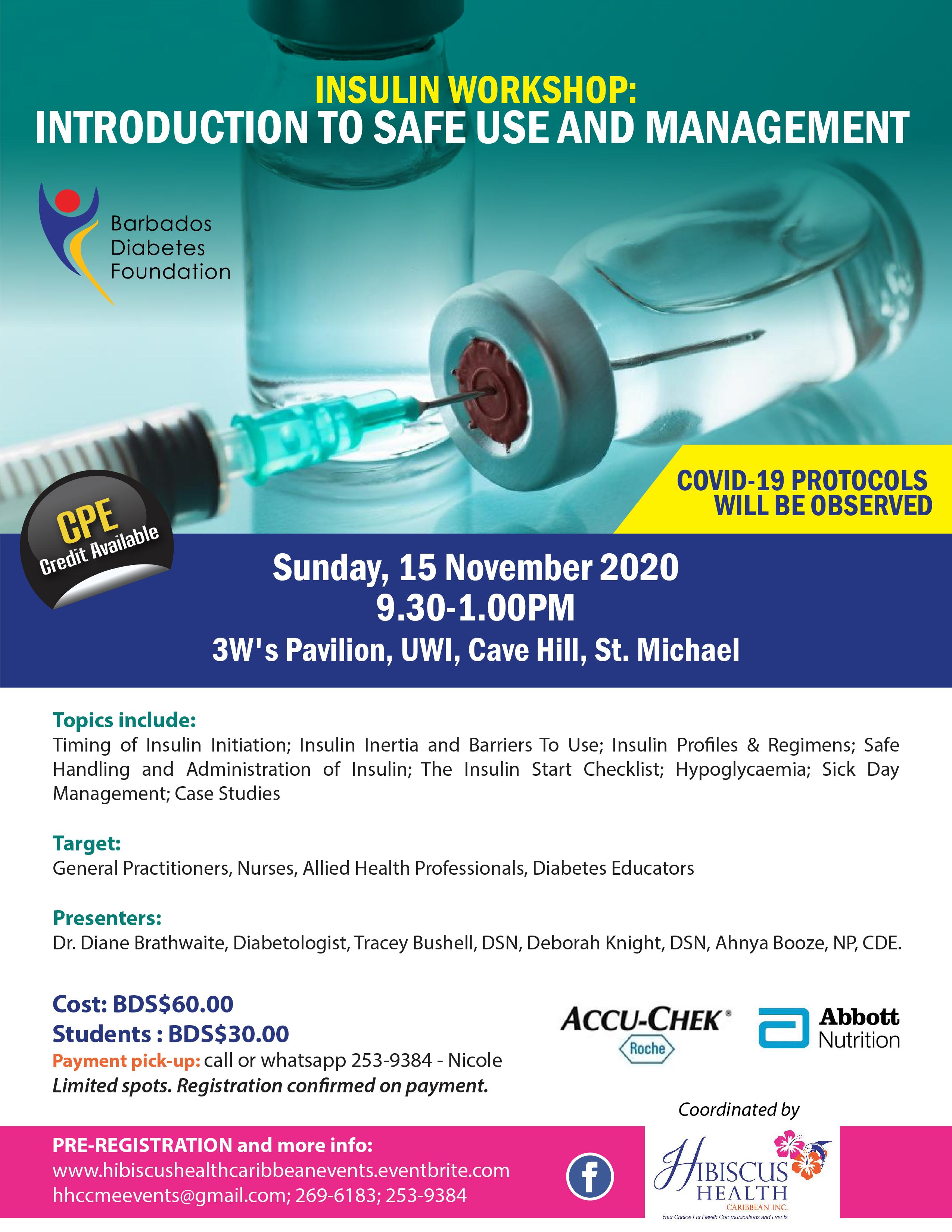 This workshop is designed to improve the knowledge and skill of health care professionals managing the diabetic patient on insulin. Topics include: Timing of Insulin Initiation, Profiles & Regimens, Safe Handling & Administration, Special Considerations (Alcohol, Sick Days, Hypos etc), Practical & Case Studies, Updates and more. It is designed for general practitioners, nurses and other allied health professionals involved in Diabetes Management. CME credits will be awarded (~5CPE credits)