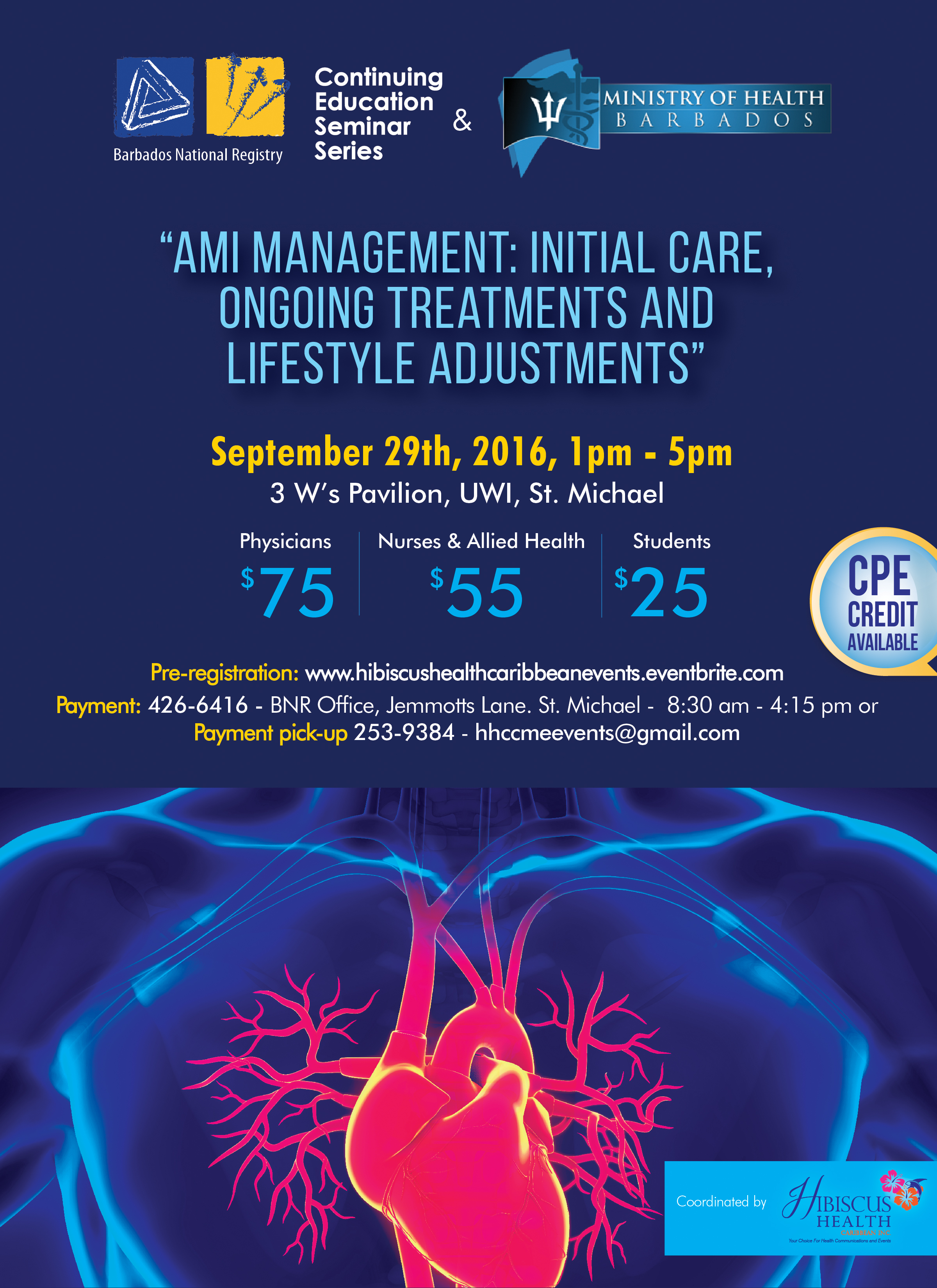 Support the Barbados National Registry (BNR) & The Ministry of Health in their Annual Continuing Medical Education Seminar Series. This year’s event focuses on the heart, looking at Acute Myocardial Infarction, initial Care, Ongoing Treatments and Lifestyle Adjustments. Speakers include Dr. Dawn Scantlebury, Interventional Cardiologist, Dr. Rudolph Delice, Internist and others. Attendees will also get the opportunity to hear the latest data and research pertinent to this issue – all work understake by the Barbados National Registry. Pre-register at www.hibiscushealthcaribbeanevents.eventbrite.com. Payment can be made at the BNR Office on Jemmots Lane or payment pick-up can be arranged by contacting Hibiscus Health Caribbean at hhccmeents@gmail.com or calling 246-253-9384.