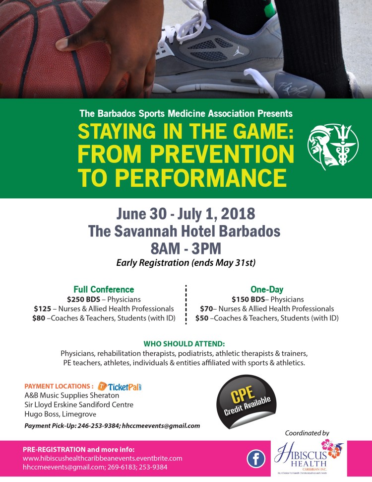 The Barbados Sports Medicine Association presents “Staying in the Game: From Prevention to Performance”, a Sports Medicine Conference on June 30 – July 1, 2018 at the Savannah Hotel, Barbados.
